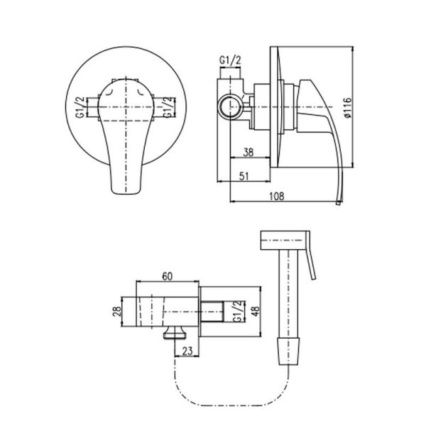 Комплектация: смеситель, лейка, шланговое подключение с держателем лейки, шланг, внутренняя часть
