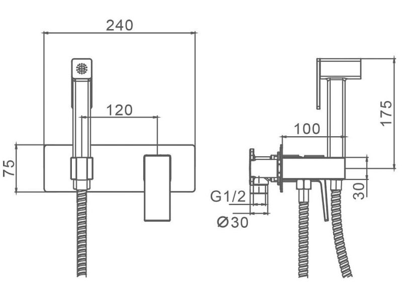 Встраиваемый гигиенический душ, выполнен из латуни, шланг 120 см и лейка в комплекте.