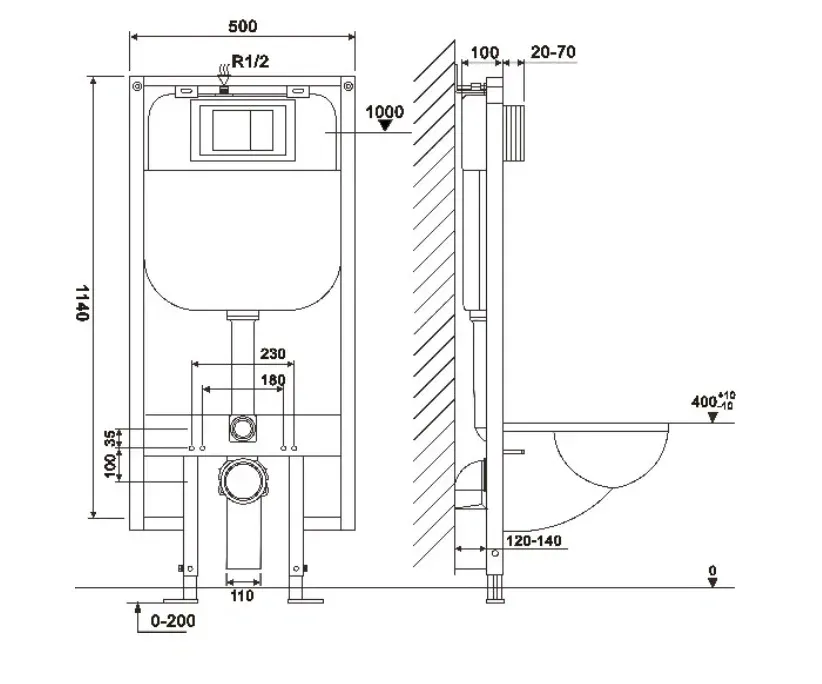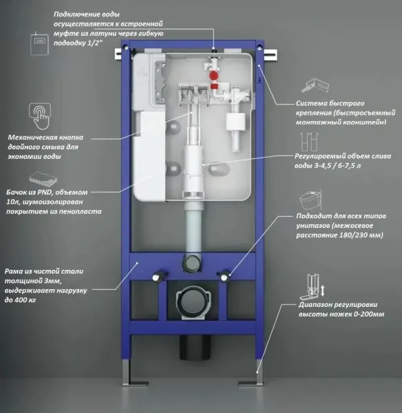 Сварная pама из НЕРЖАВЕЮЩЕЙ СТАЛИ с порошковой окраской, с повышенной толщиной 3мм!!! – гарантия долгой службы и устойчивости к коррозии. Максимальная возможная нагрузка – 400кг. Высоту установки инсталляции можно регулировать ножками, выдвижение которых возможно без интервалов от 0 до 200мм.