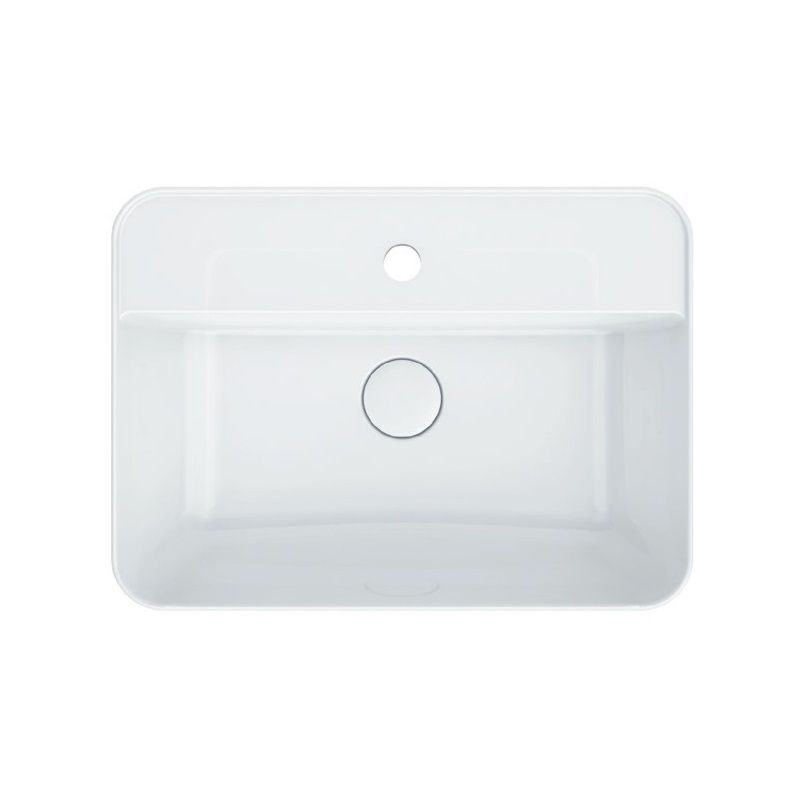 Белая глянцевая подвесная раковина с отверстием под смеситель и крепежом, ширина 55 см. Донный клапан в комплект не входит, рекомендуем донный клапан . Донный клапан конструктивно не закрывается полностью, так как у раковины отсутствует отверстие слив-перелив.