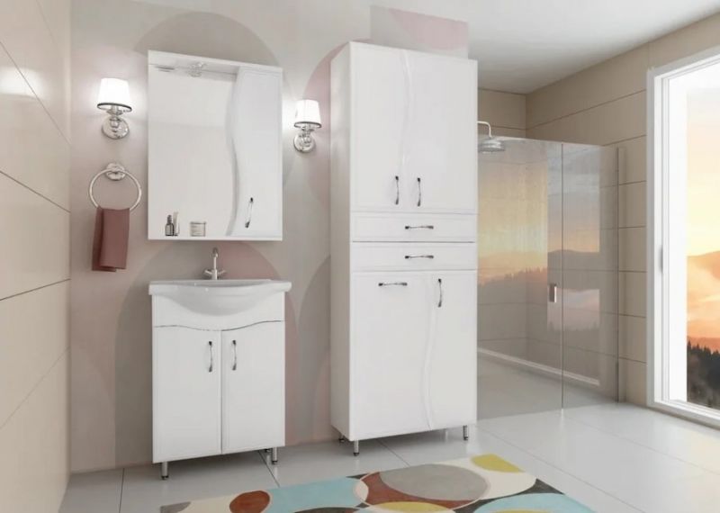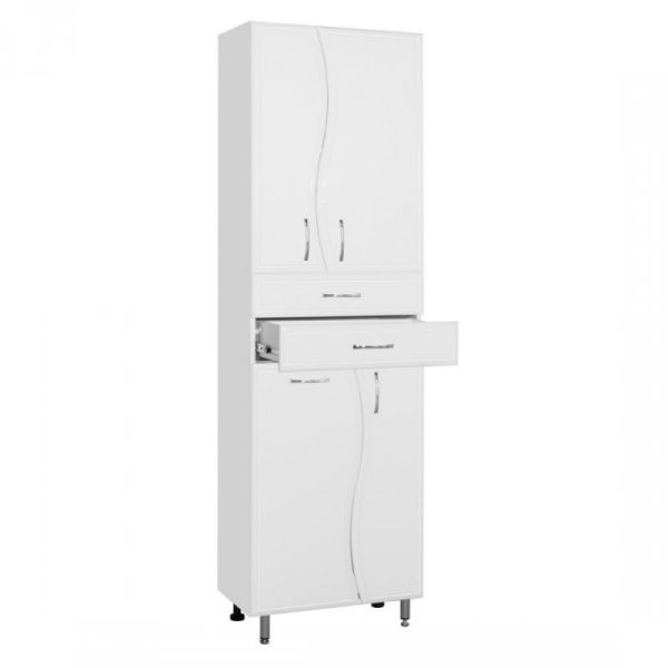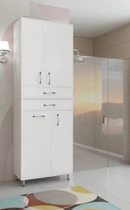 Колонна Style Line Волна ЛС-000010050 белый матовыйШкаф-пенал Style Line Волна 70 ЛС-000010050 - весьма удобный и функциональный шкаф, позволяющий бережно и аккуратно хранить массу различных вещей, и принадлежностей.Конструкция изделия в верхней части имеет две распашные дверцы с полкой, в центре установлены два выдвижных ящика, а снизу - справа распашная дверца с полкой, слева откидной фасад с бельевой корзиной.Визуально шкаф выполнен в базовом белом цвете, из качественного влагостойкого МДФ, покрытого пленкой ПВХ. В силуэте фасадов прослеживается плавная волнистая линия, оправдывающая выбранное название для коллекции.