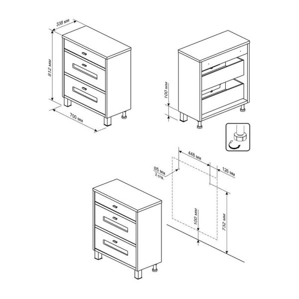 • три выдвижных ящика