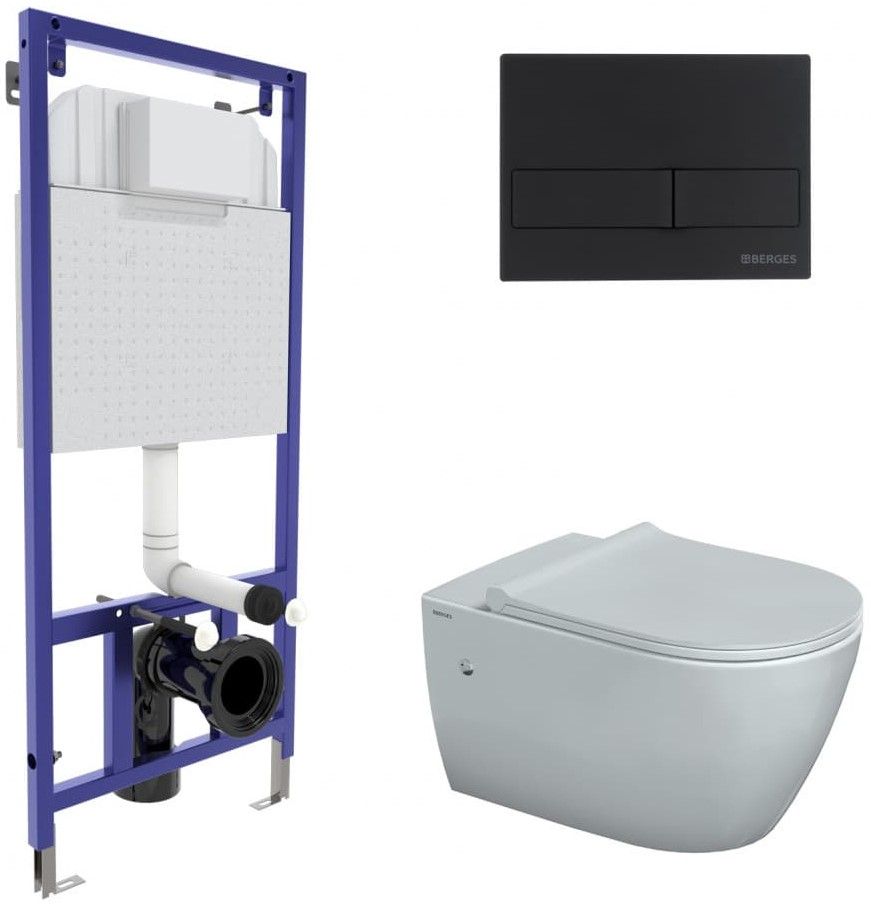 Полный комплект BERGES для монтажа подвесного унитаза. 1. Инсталляция NOVUM525Толщина бачка 80 мм.Межосевое расстояние под крепежные шпильки унитаза 18 и 23 см.Резервуар воды объемом 10 литров с тепло-шумоизоляцией.Уровень шума при давлении 3 бар не превышает 13 дБ.Подвод воды сверху (G1/2 наружная).Объем смыва 3/6 литра с возможностью регулировки. Металлический каркас, окрашенный антикоррозийной эмалью, расчетная нагрузка до 400 кг.Ножки регулировки высоты из оцинкованной стали. Возможность установки в угол. 2. кнопка L5 черная Soft TouchABS-пластик 3. унитаз MASCON Rimless,безободковая система смыва, антибактериальное покрытиеэкономия воды, скрытый крепеж 4. сиденье дюропласт Toma Slim SOмикролифт, быстросъем. Все крепежи для установки в комплекте