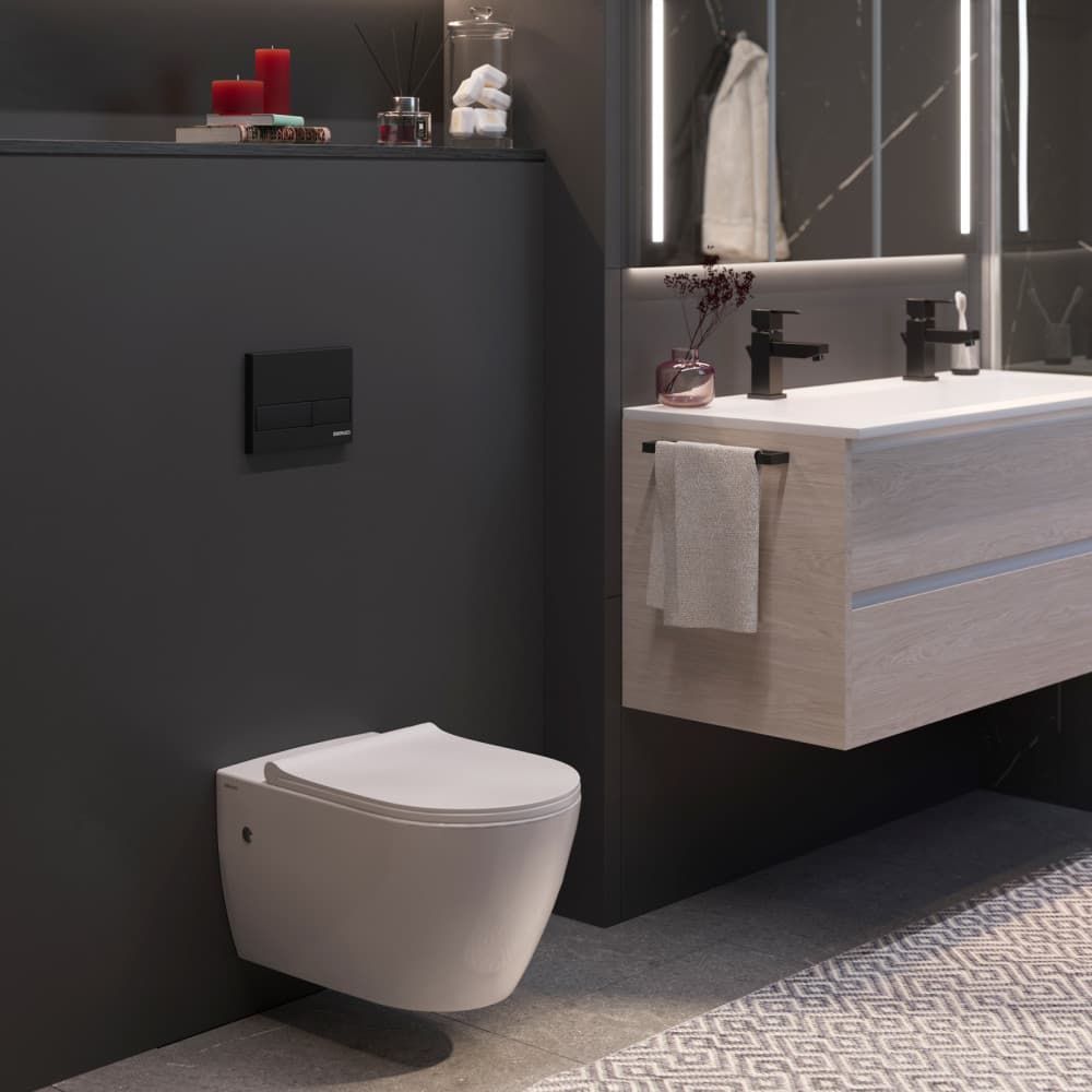 Комплект Berges 4в1 043217: инсталляция NOVUM525 кнопка L5 SoftTouch чёрная унитаз Mascon Rimless сиденье Toma Slim SO купить