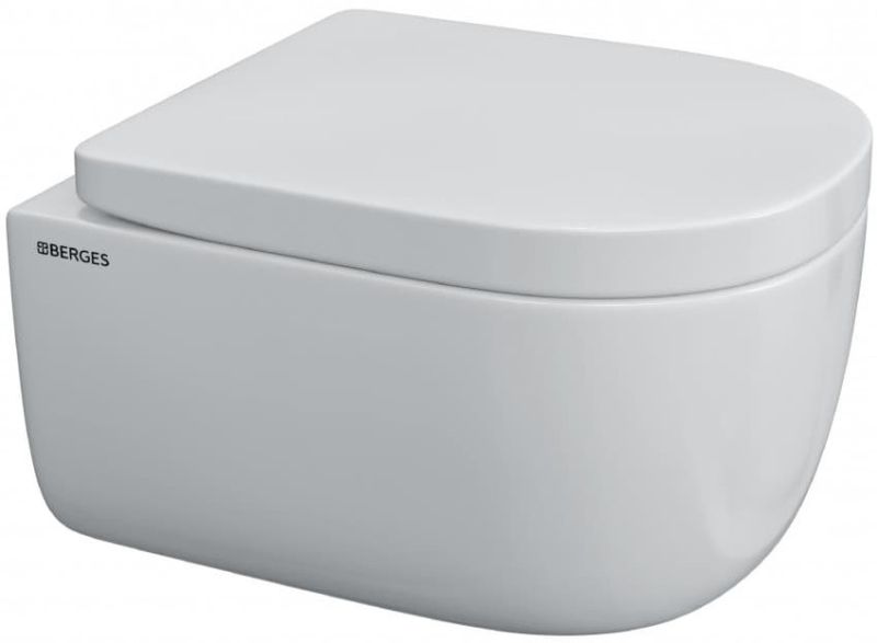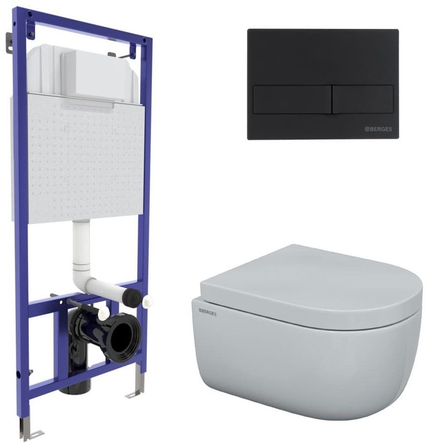 Комплект Berges 4в1 043232: инсталляция NOVUM525 кнопка L5 SoftTouch чёрная унитаз EGO Rimless сиденье Toma SO