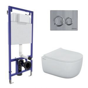 Полный комплект BERGES для монтажа подвесного унитаза. 1. Инсталляция NOVUM525Толщина бачка 80 мм.Межосевое расстояние под крепежные шпильки унитаза 18 и 23 см.Резервуар воды объемом 10 литров с тепло-шумоизоляцией.Уровень шума при давлении 3 бар не превышает 13 дБ.Подвод воды сверху (G1/2 наружная).Объем смыва 3/6 литра с возможностью регулировки. Металлический каркас, окрашенный антикоррозийной эмалью, расчетная нагрузка до 400 кг.Ножки регулировки высоты из оцинкованной стали. Возможность установки в угол. 2. кнопка O3 хром глянец 3. унитаз EGO Rimless,безободковая система смыва, антибактериальное покрытиеэкономия воды, скрытый крепеж 4. сиденье дюропласт Okus Slim SOмикролифт, быстросъем. Все крепежи для установки в комплекте