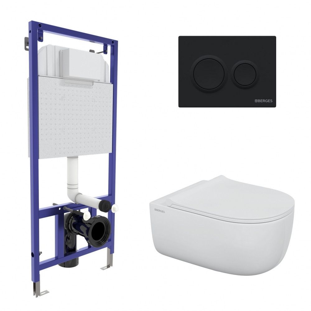 Полный комплект BERGES для монтажа подвесного унитаза. 1. Инсталляция NOVUM525Толщина бачка 80 мм.Межосевое расстояние под крепежные шпильки унитаза 18 и 23 см.Резервуар воды объемом 10 литров с тепло-шумоизоляцией.Уровень шума при давлении 3 бар не превышает 13 дБ.Подвод воды сверху (G1/2 наружная).Объем смыва 3/6 литра с возможностью регулировки. Металлический каркас, окрашенный антикоррозийной эмалью, расчетная нагрузка до 400 кг.Ножки регулировки высоты из оцинкованной стали. Возможность установки в угол. 2. кнопка O5 черная Soft Touch 3. унитаз EGO XL Rimless,безободковая система смыва, антибактериальное покрытиеэкономия воды, скрытый крепеж 4. сиденье дюропласт Okus Slim SOмикролифт, быстросъем. Все крепежи для установки в комплекте