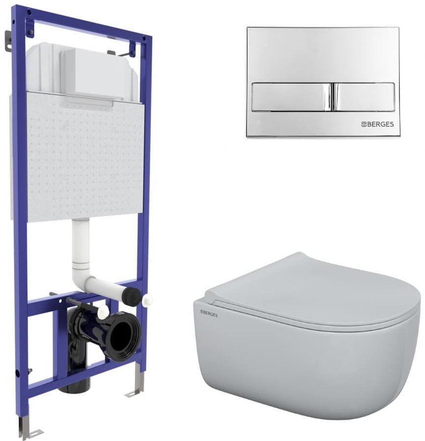 Полный комплект BERGES для монтажа подвесного унитаза. 1. Инсталляция NOVUM525Толщина бачка 80 мм.Межосевое расстояние под крепежные шпильки унитаза 18 и 23 см.Резервуар воды объемом 10 литров с тепло-шумоизоляцией.Уровень шума при давлении 3 бар не превышает 13 дБ.Подвод воды сверху (G1/2 наружная).Объем смыва 3/6 литра с возможностью регулировки. Металлический каркас, окрашенный антикоррозийной эмалью, расчетная нагрузка до 400 кг.Ножки регулировки высоты из оцинкованной стали. Возможность установки в угол. 2. кнопка L3 хром глянецABS-пластик 3. унитаз EGO Rimless,безободковая система смыва, антибактериальное покрытиеэкономия воды, скрытый крепеж 4. сиденье дюропласт Toma Slim SOмикролифт, быстросъем. Все крепежи для установки в комплекте