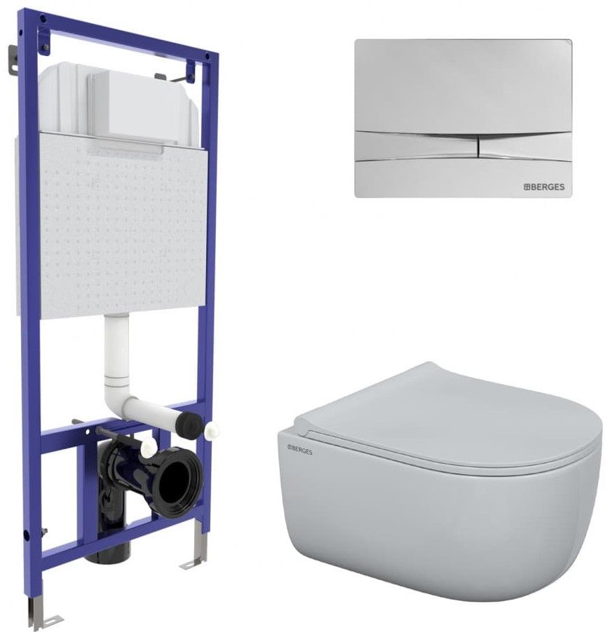 Комплект Berges 4в1 047253: инсталляция NOVUM525 кнопка F3 хром глянец унитаз EGO Rimless сиденье Toma Slim SO
