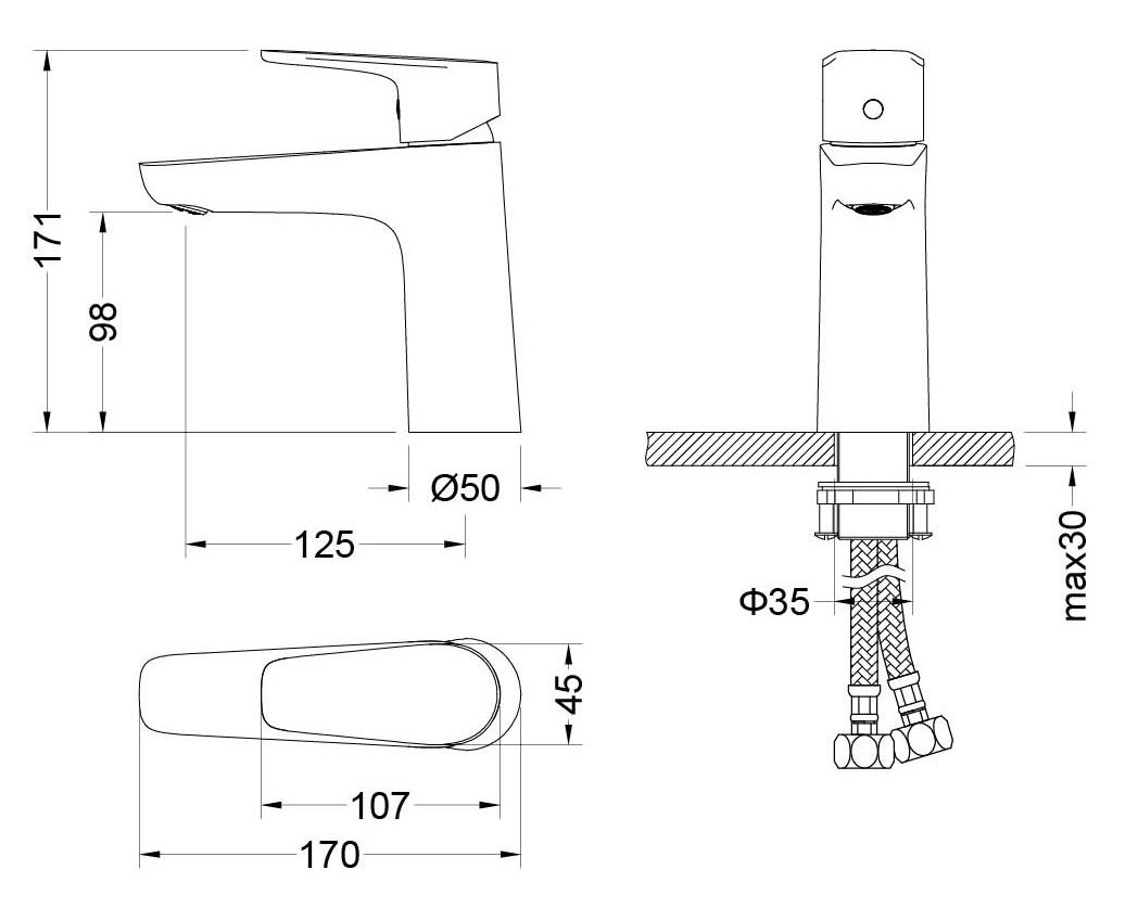 В комплекте: смеситель; гибкая подводка 60см; монтажный комплект