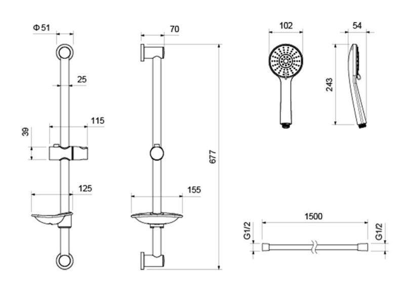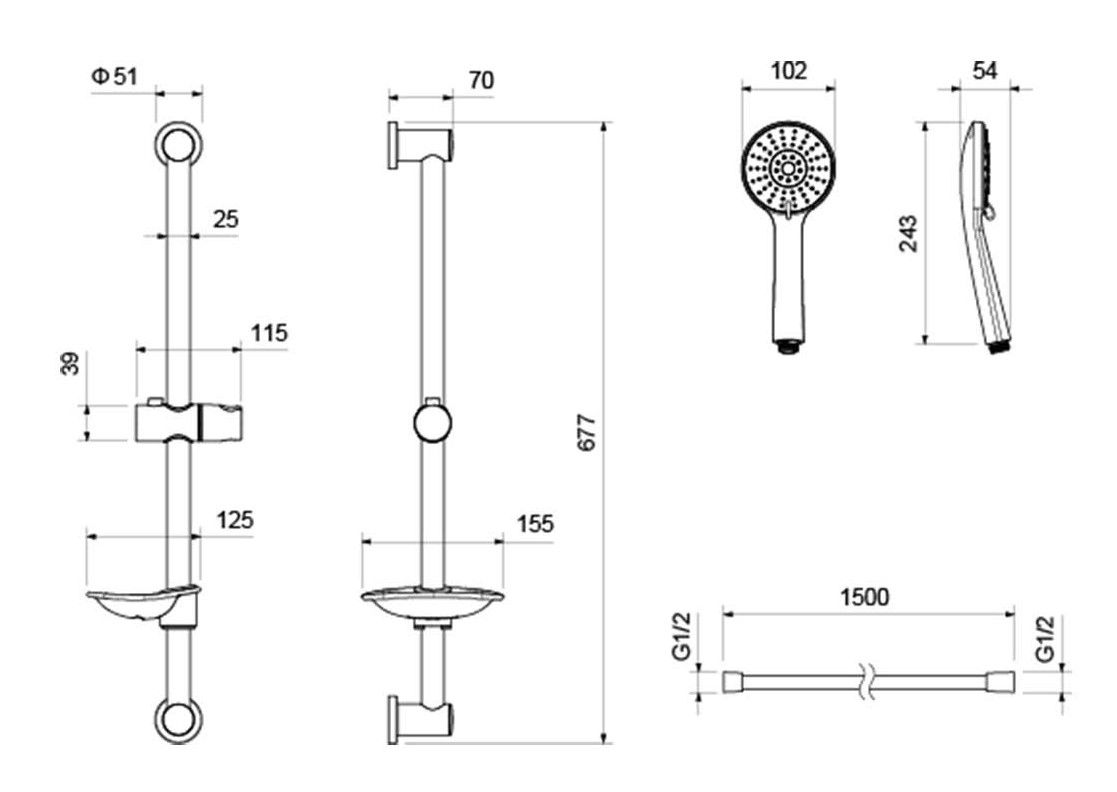 • Душевой гарнитур: душевая стойка с мыльницей, лейка, шланг