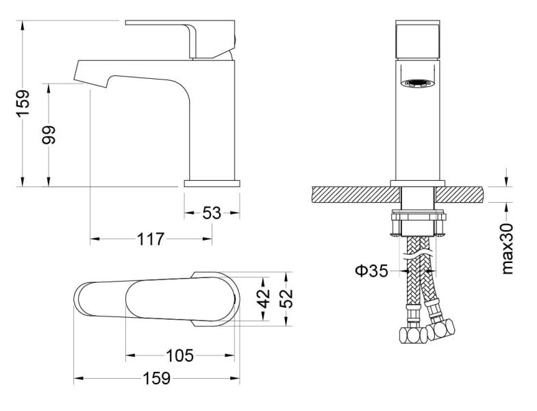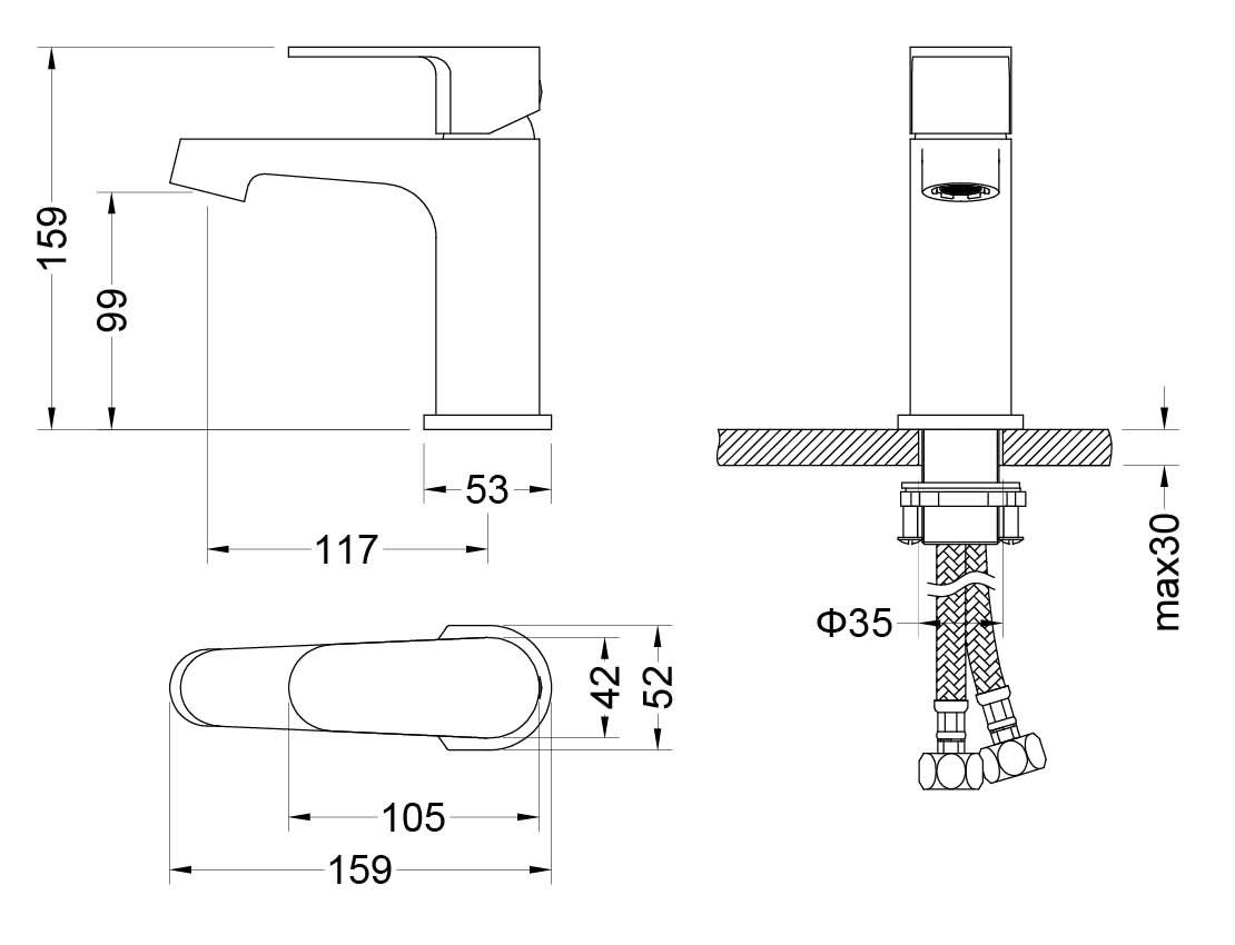 В комплекте: смеситель; гибкая подводка 60см; монтажный комплект
