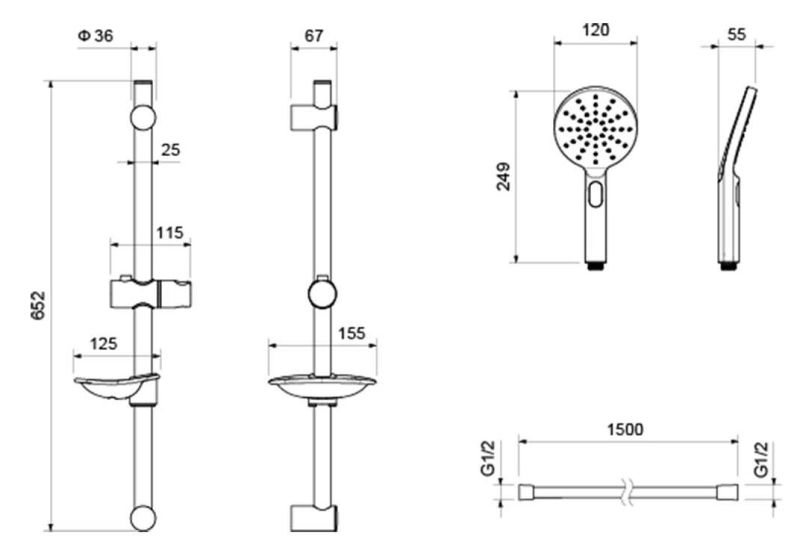 • Душевой гарнитур: душевая стойка с мыльницей, лейка, шланг