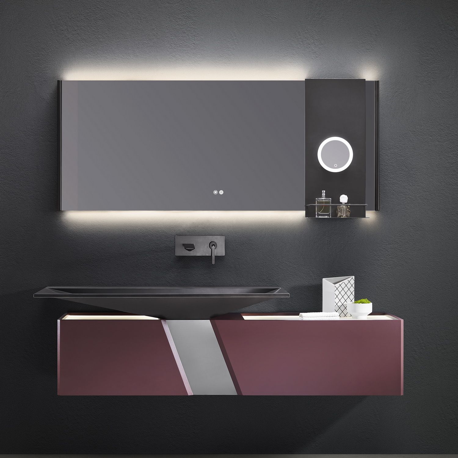 Комплект мебели из премиальной линейки датского производителя Black&White в габаритных размерах 160×43см. При создании коллекции используются влагостойкие и износостойкие материалы разработанные в соответствии с прогрессивными технологиями в мебелестроении. Тумба изготовлена из комбинированного листа, в котором основанием является алюминиевая структура в форме сот для шумопоглащения и дополнительной жесткости, а поверх устанавливается лист из нержавеющей стали SUS 304. Следующим этапом наносится слой антикоррозионного состава с финишным покрытием влагостойкой эмалью. В данной серии столешница и раковина также выполнены из нержавеющей стали, что благоприятно сказывается на ресурсе элементов,которые наиболее часто подвержены механическому воздействию. Для хранения предусмотрены два выдвижных ящика с фасадами асимметричной формы, направляющие устанавливаются бренда Unihopper с доводчиками.Важным стилистическим дополнением отмечается контурная подсветка, которая срабатывает при приближении человека от 3-х метров.Зеркальное полотно устанавливается на панель из нержавеющей стали , оборудовано диодной подсветкой и функцией антизапотевания.С правой стороны установлены полочки из аналогичного материала для хранения ванных принадлежностей и интегрированным косметическим зеркалом.