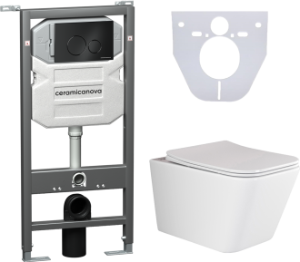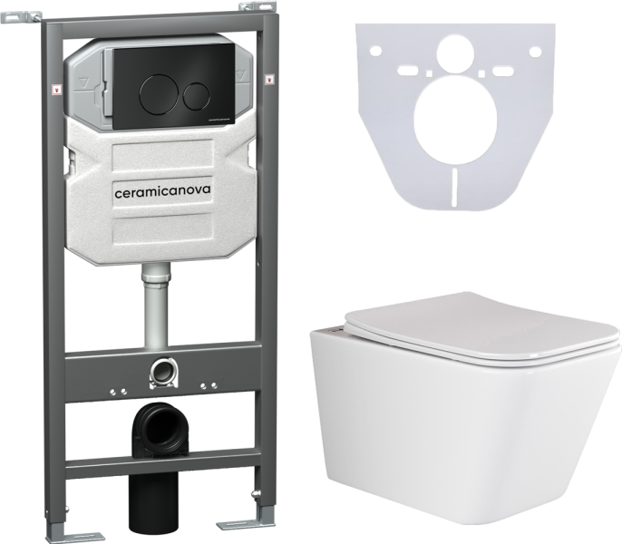 Сет 4 в 1: CN3007_1001B_1000 Подвесной унитаз Metric Rimless арт. CN3007Шумоизоляционная панель для инсталляции арт. CN1000Система инсталляции для унитазов CERAMICANOVA Envision с кнопкой смыва Round цвет чёрный матовый и креплениями, арт. CN1001B Подвесной безободковый унитаз Ceramica Nova Metric Rimless, крышка микролифт, CN3007