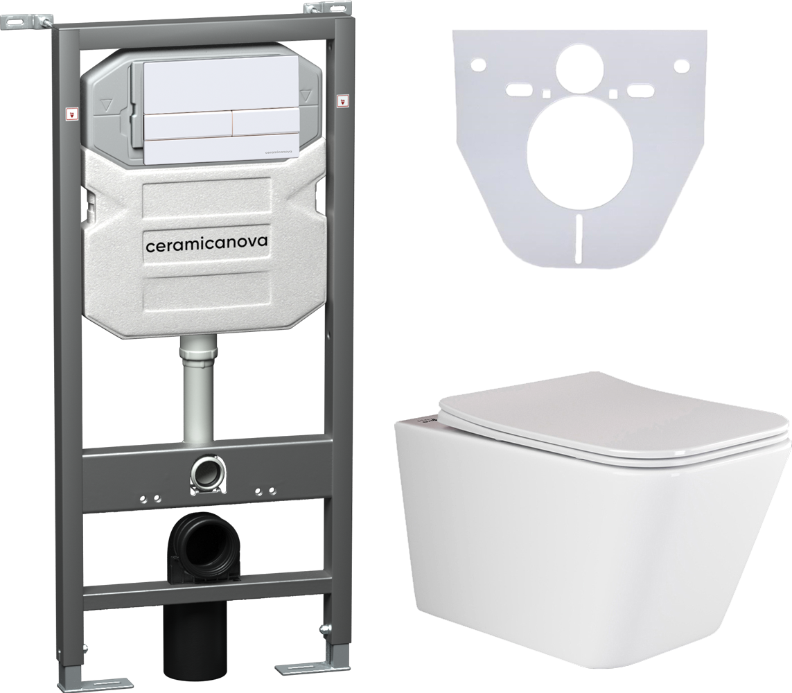 Сет 4 в 1: CN3007_1002W_1000Подвесной унитаз Metric Rimless арт. CN3007Шумоизоляционная панель для инсталляции арт. CN1000Система инсталляции для унитазов CERAMICANOVA Envision с кнопкой смыва Flat цвет белый, креплениями, арт. CN1002W Подвесной безободковый унитаз Ceramica Nova Metric Rimless, крышка микролифт, CN3007