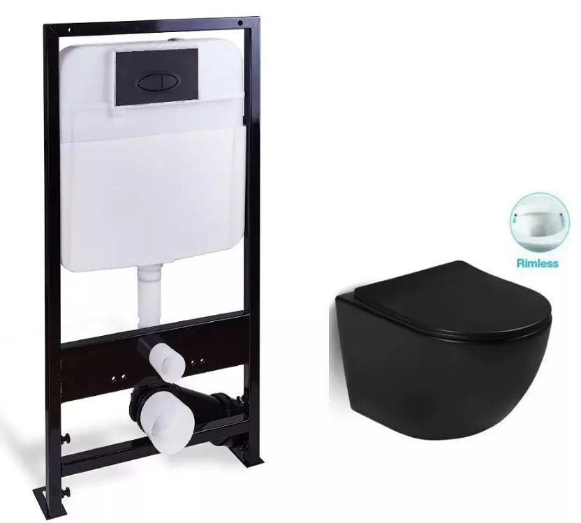 Комплект SantiLine SL-5018MB+SL-03 безободковый чёрный матовый унитаз с сиденьем микролифт и инсталляция с клавишей смыва чёрный матовый купить