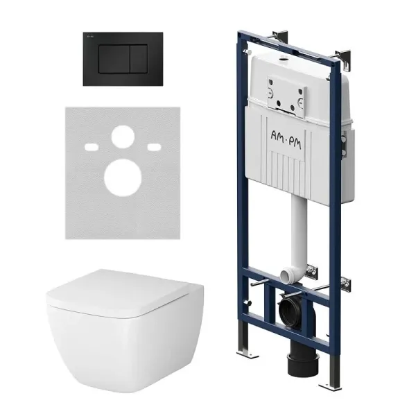 Комплект унитаза с инсталляцией AM.PM Gem IS100238.901701 сиденье микролифтПолностью готовый к установке комплект: система инсталляции с клавишей подвесной унитаз с сиденьем включающий все необходимые крепления патрубки звукоизолирующую прокладку. Экономия пространства благодаря узкому бачку – 120 мм глубиной. Заливной клапан с низким уровнем шума - Класс II согласно европейского стандарта EN 14124. Функция SetUp : Гибкая система крепежа – универсальность и эффективность установочного процесса. Гибко обходит вертикальные и горизонтальные трубы. Высокая прочность и износостойкость. Выдерживает нагрузку до 400 кг. Подходит для унитазов любых размеров. Армированный шланг подачи воды двойная прокладка слива и подачи воды. В комплекте механическая двухрежимная клавиша из ABS пластика в цвете матовый черный. Подключение воды сзади сверху. Современный дизайн и трендовая квадратная форма чаши унитаза Gem Flashclean созданные в собственной студии AM.PM Design. FlashClean - новое поколение безободковых унитазов без использования пластика: 100% гигиеничности 0% брызг. Безупречная поверхность: изготовлен из стекловидного фарфора самого гигиеничного и влагостойкого материала. Компактное дизайнерское решение: идеально впишется в санузел любого размера благодаря проекции 50 см. В комплекте быстросъемное сиденье из дюропласта с механизмом плавного закрывания. Материал сиденья дюропласт устойчивый к появлению царапин в сочетании с креплениями из нержавеющей гарантируют долговечность сиденья. Актуальный дизайн сиденья slim wrap-over с однокнопочным механизмом быстрого снятия.