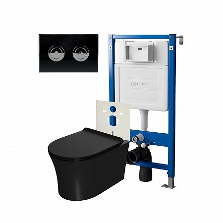 Сет: Система инсталляции пневматическая Point Элемент П для подвесного унитаза PN45121 + Клавиша смыва для пневматической инсталляции Point Венера, установка в стену, черный/хром, PN44071BC + Унитаз подвесной Point Вега безободковый, чёрн мат, PN41711BM