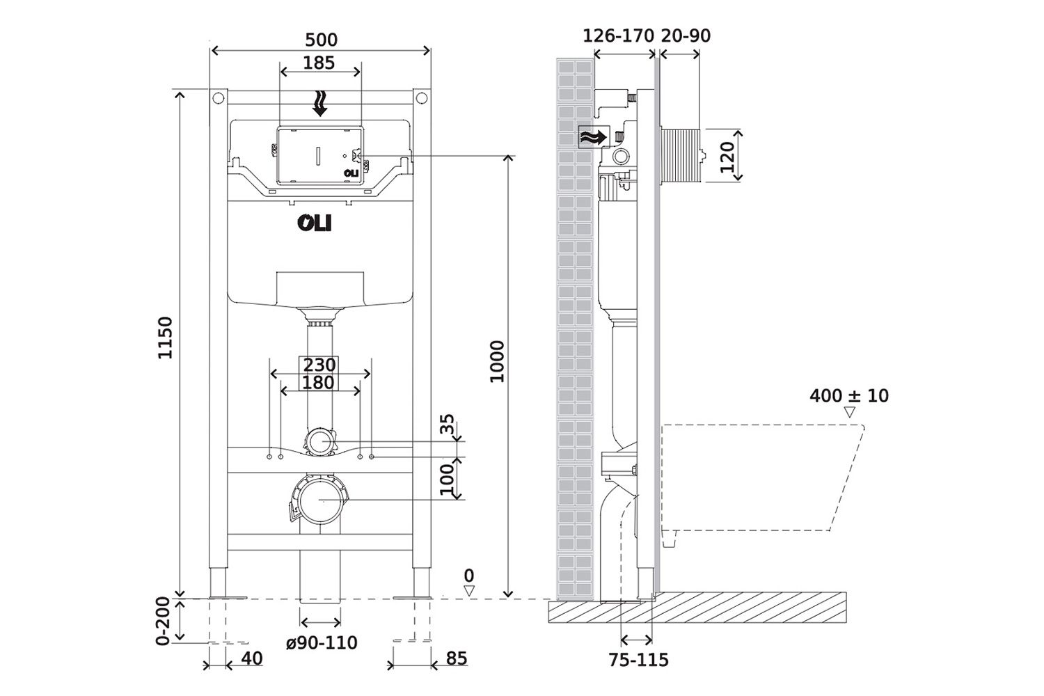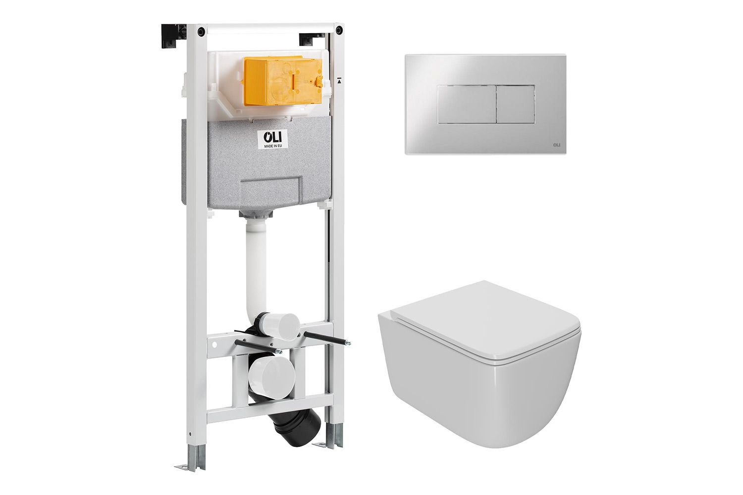 Инсталляция для унитаза. Рама инсталляции изготовлена из стали и покрыта прочной порошковой антикоррозионной краской. Отличительная особенность данной системы инсталляции - возможность регулировки по высоте на 20 см с помощью ножек из оцинкованной стали. Бачок скрытого монтажа выполнен из полимерного материала HDPE, что соответствует ведущим Европейским стандартам. Для защиты от конденсата, а также обеспечения бесшумной работы, резервуар скрытого монтажа обшит пенопластом.