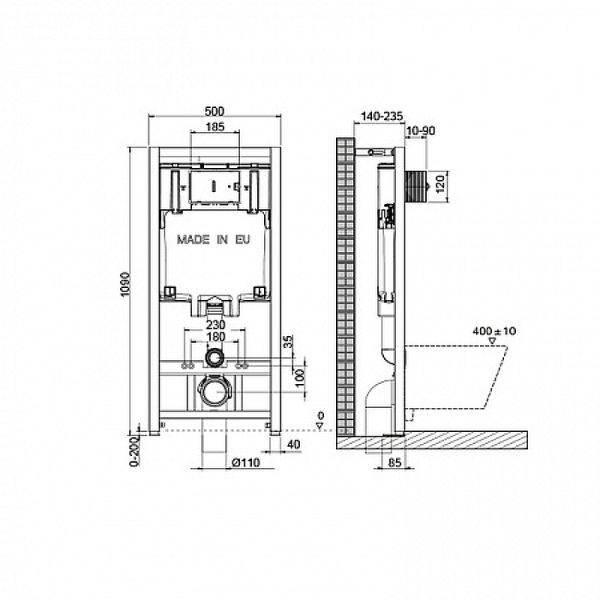Инсталляция для унитаза. Рама инсталляции изготовлена из стали и покрыта прочной порошковой антикоррозионной краской. Отличительная особенность данной системы инсталляции - возможность регулировки по высоте на 20 см с помощью ножек из оцинкованной стали. Бачок скрытого монтажа выполнен из полимерного материала HDPE, что соответствует ведущим Европейским стандартам. Для защиты от конденсата, а также обеспечения бесшумной работы, резервуар скрытого монтажа обшит пенопластом.