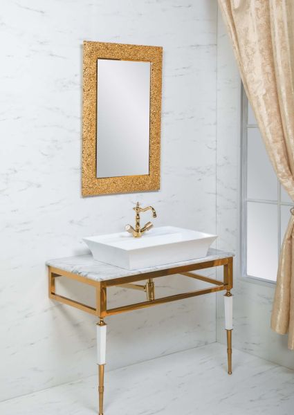 Консоль с раковиной Vogue шириной 100 см цветом золото.Консоли произведены из нержавеющей стали благодаря чему стойки к коррозии. Гальваническое покрытие исполнено в цветах хром и золото. Можно выбрать столешницу из мрамора, хрустального каленого стекла в различных цветовых исполнениях, и Solid Glass (передовой материал, в состав которого входит мраморная крошка и стекло). Раковины-чаши, которыми можно дополнть консоли, выполнены из Corian, хрустального стекла, керамики. Хорошим дополнением к консолям являются пеналы Armadi Art, а также сифоны, клик-клаки и смесители Boheme.Мебель можно дополнить пеналом и зеркалом