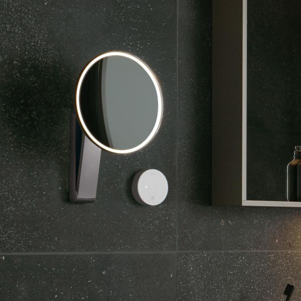 Косметическое зеркало Keuco iLook_move 17612179002 алюминийKeuco iLook_move 17612179002 Косметическое зеркало с подсветкой (алюминий). 5-уровневое переключение цвета подсветки от 2700 Кельвин (теплый белый) до 6500 Кельвин (дневной свет), стеклянная панель управления, электрокабель интегрирован в поворотный кронштейн, настенная модель на кронштейне с шарниром, регулируется в трех плоскостях, одностороннее зеркало, вогнутое, коэфффициент увеличения x 5. Управление: Стеклянная сенсорная панель и светодиодный индикатор. Электроснабжение: подключение к сети через подрозетник, 12 В встраиваемый сетевой блок питания, Напряжение на входе: 220-240 В, Потребление в режиме ожидания: < 0,5 Вт. Подсветка: Светодиод 4,5 Вт (срок работы > 50.000 часов). Поставляется вместе со встраиваемым блоком питания и низковольтным соединительным кабелем (500 мм). По причине внутреннего положения кабеля расположение зеркала должно быть определено до отделки стены.