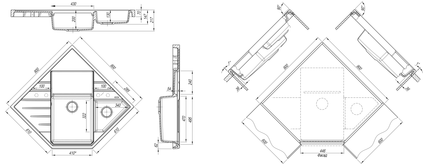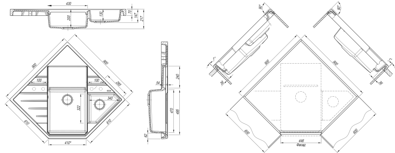 В комплектацию входит: отводная арматура с выпуском и переливом для двух чаш, крепежи, шаблон для выреза на столешнице, а также разделочная доска из дерева.