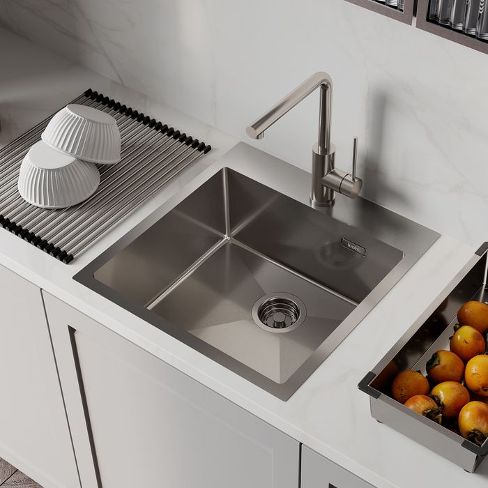 Мойка Haze отличается современным дизайном и ручным методом производства, что позволяет добиться идеальной геометрии – малый радиус скругления углов увеличивает рабочее пространство без «слепых» зон. Удобно разместить много посуды и мыть крупные предметы. Подходит для шкафа от 50 см.