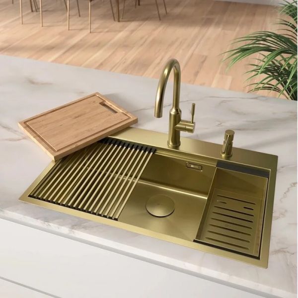 Кухонная мойка Lemark Iordana 780 9938118 в комплекте с разделочной доской ролл-матом и коландером светлое золото купить