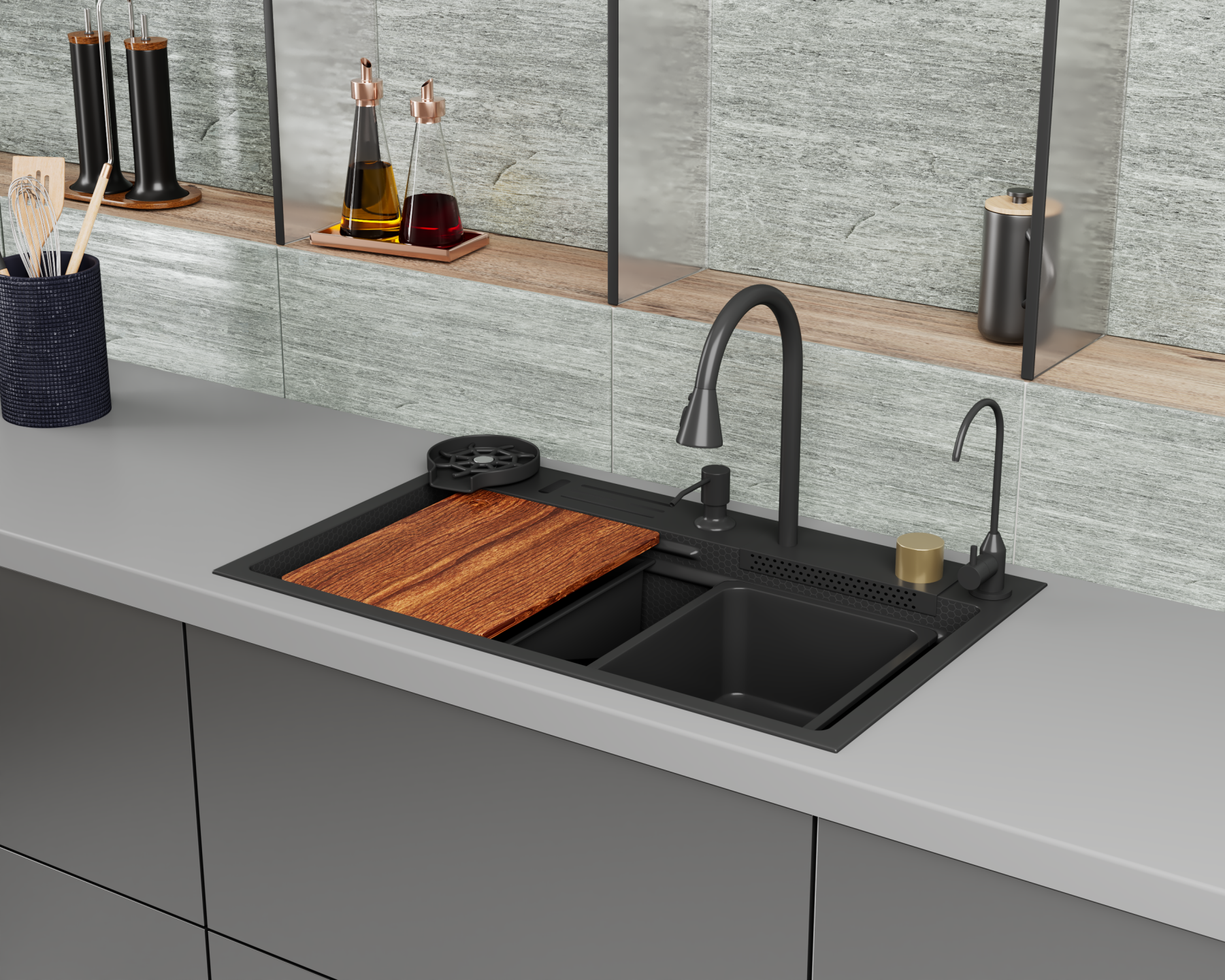 Кухонная мойка многофункц. DQ нерж.сталь темный графит в комплекте со смесителем и аксессуарами (DKS754605)