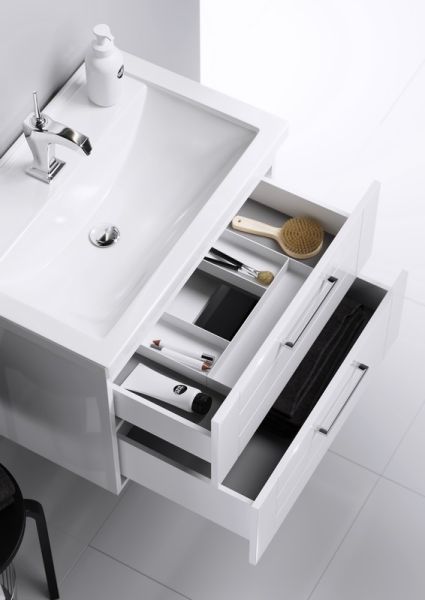 Вместительная задняя полочка обеспечивает место для размещения необходимых мелочей, а встраиваемая в мебельную тумбу конструкция создает дополнительное пространство для хранения.