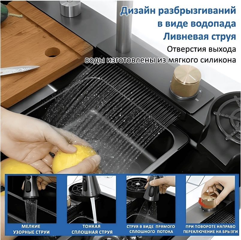 Премиальная мойка из нержавеющей стали SUS 304 сочетает эргономику, прочность и бесшумность. Усиленная 3 мм верхняя пластина гарантирует устойчивость, а глубокая чаша (700×350×220 мм) вмещает даже крупную посуду. Благодаря шумопоглощающему покрытию и толщине стенок 1,0 мм мойка работает практически бесшумно.