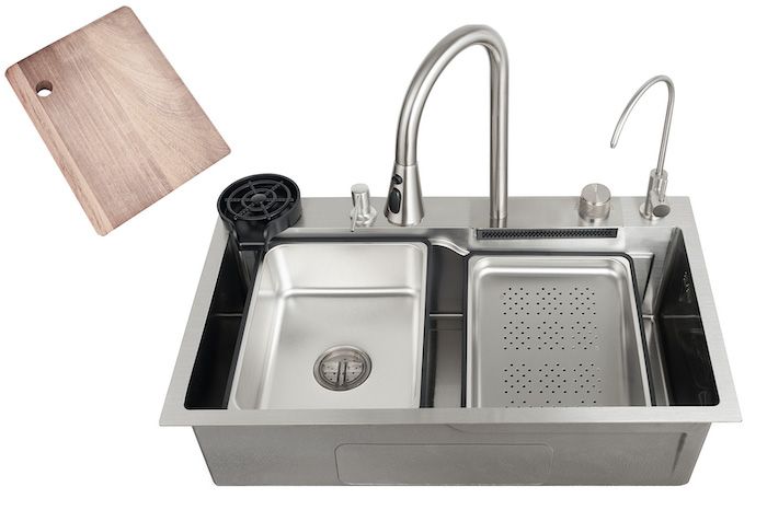 Смеситель 3-в-1 с режимами "Душ", "Струя", "Водопад" и выдвижной конструкцией сделает мытье посуды effortless. Дополнительные фишки: ополаскиватель стаканов и наклонный коландер для фруктов.