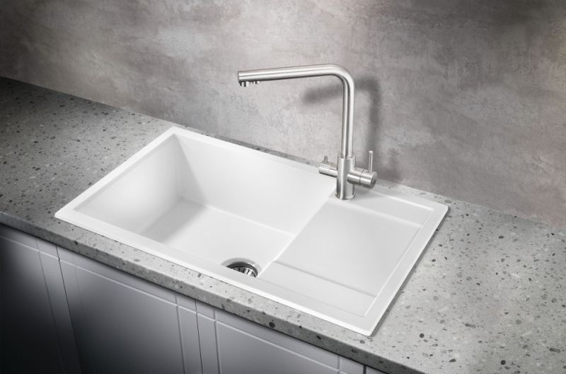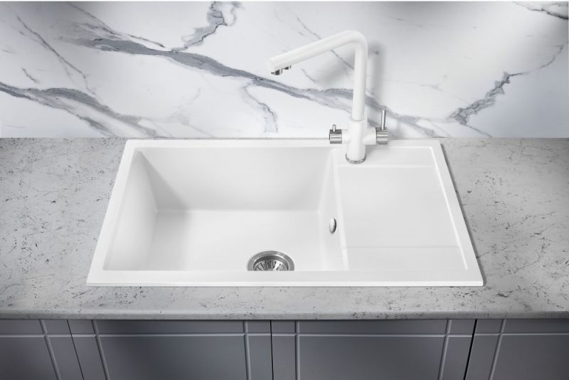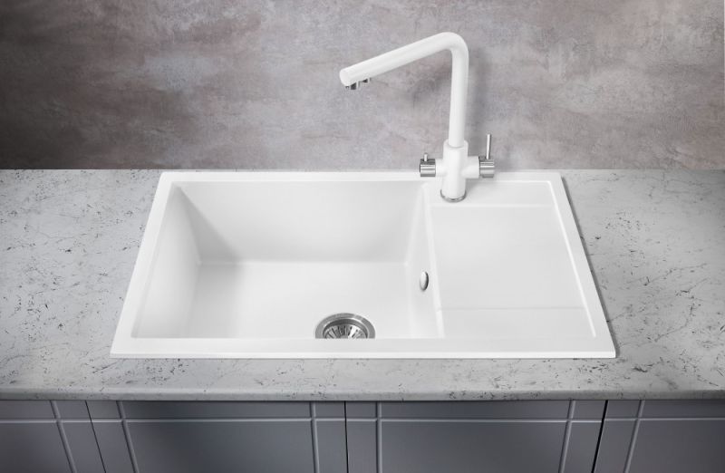 Большая врезная прямоугольная мойка для кухни из искусственного камня MILACIO Navarra 78 Cuarzo (MC.77052) в белом матовом цвете — лучшее решение, выполняющее как эстетические, так и практические функции.