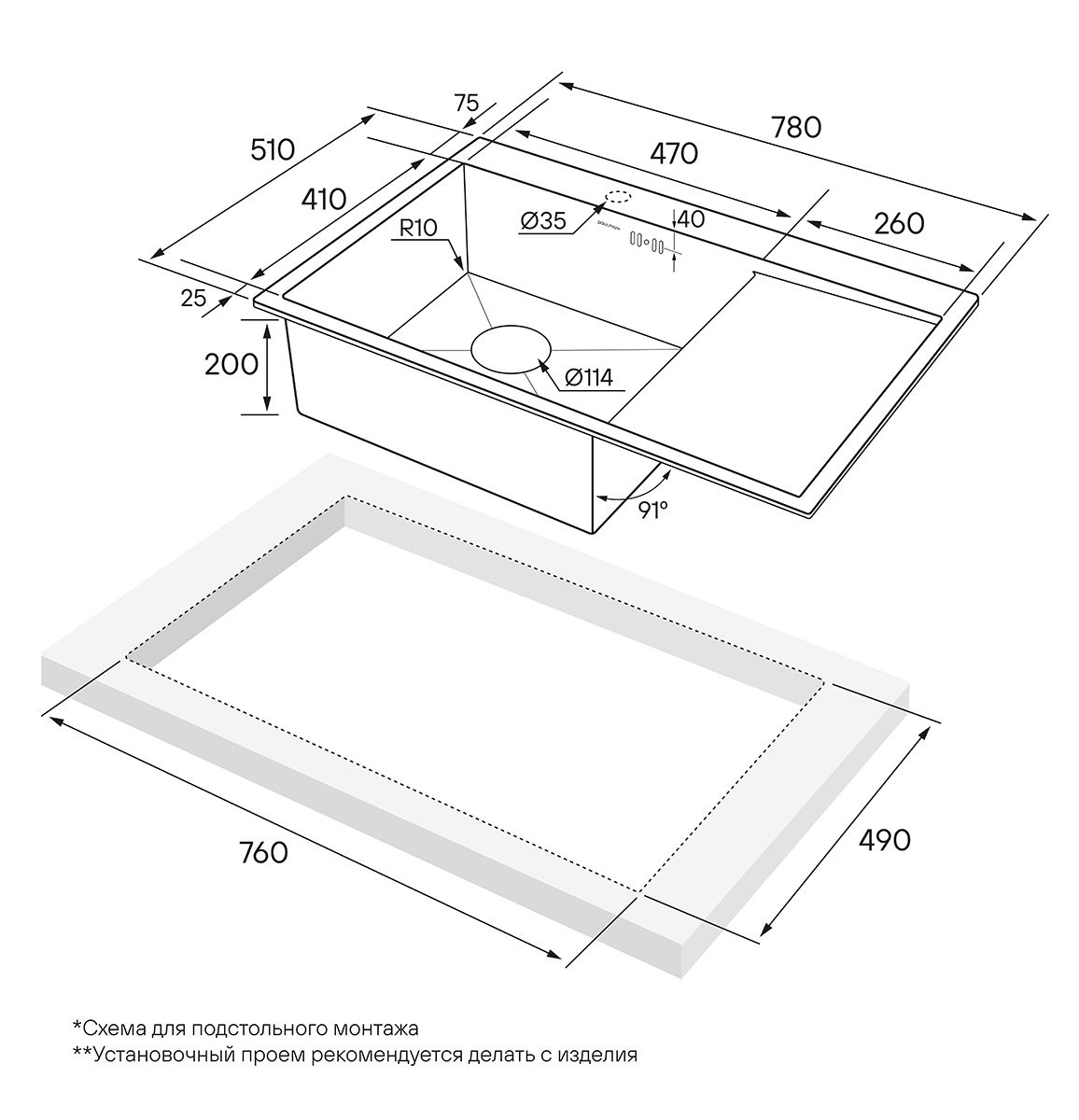 • Отверстия под смеситель: