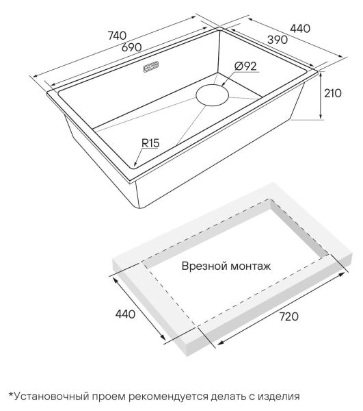 Мойка создана как для современного способа монтажа под столешницу, так и для классического врезного монтажа.Смещенный слив