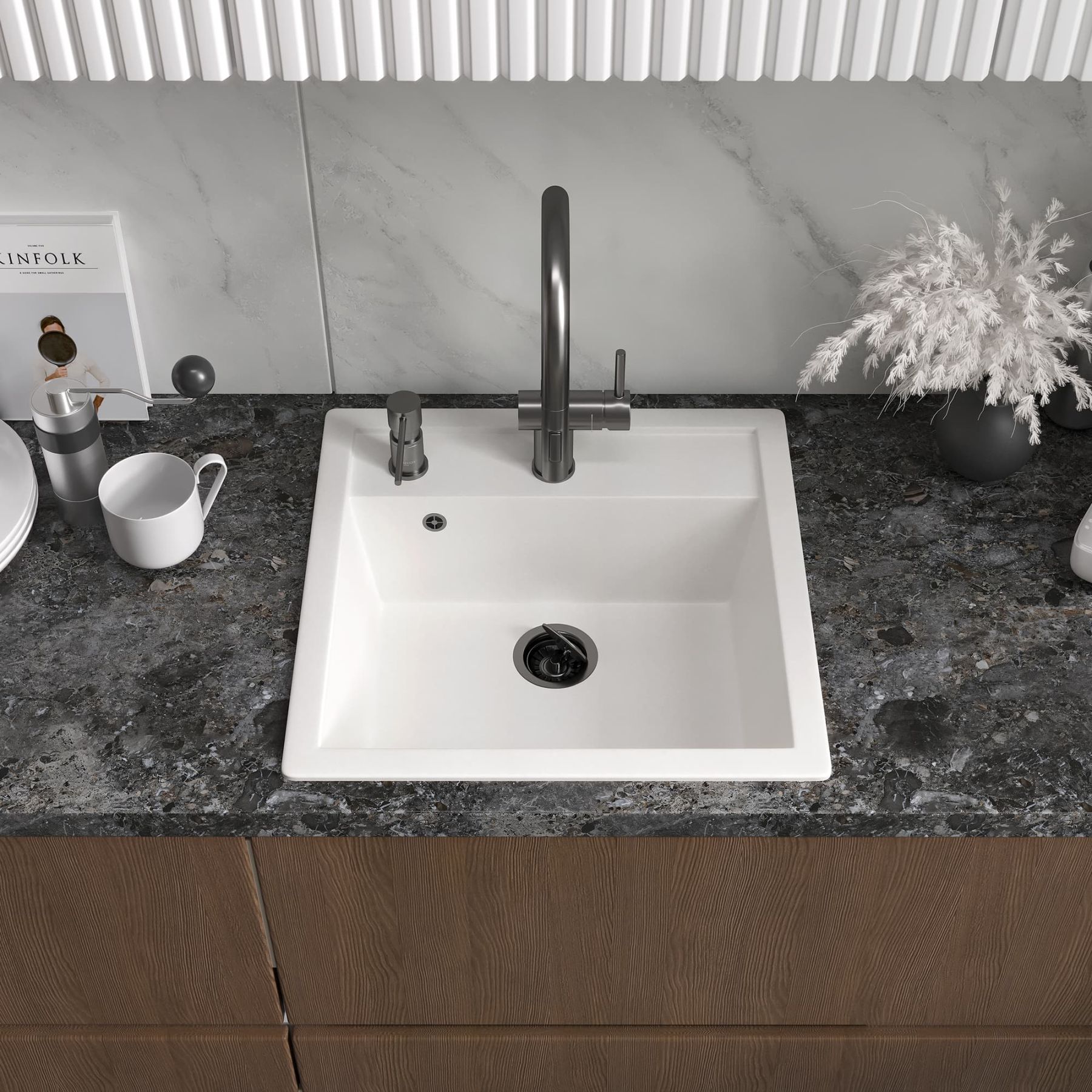 В мойке предусмотрено отверстие для установки смесителя. Используя алмазную коронку, можно сделать дополнительные отверстия для дозатора жидкого мыла или сифона с полуавтоматом.