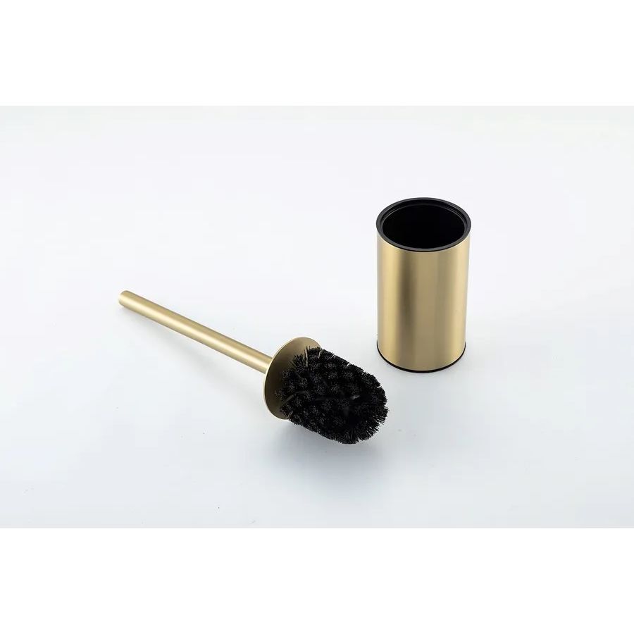 R300.31.03 Многофункциональная стойка для ванной комнаты: ершик, полочка, держатель для туалетной бумаги. Изготовлена из нержавеющей стали. Форма округлая, цвет - "золотой сатин" (матовое золото). В комплекте 2 сменные щетки - силиконовая и щетинная.