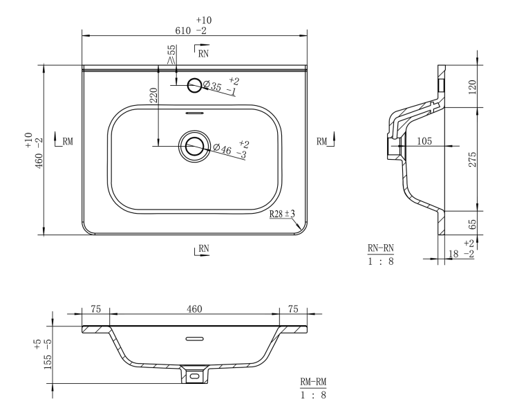 Размер раковины, мм (ш/г/в): 610x460x155
