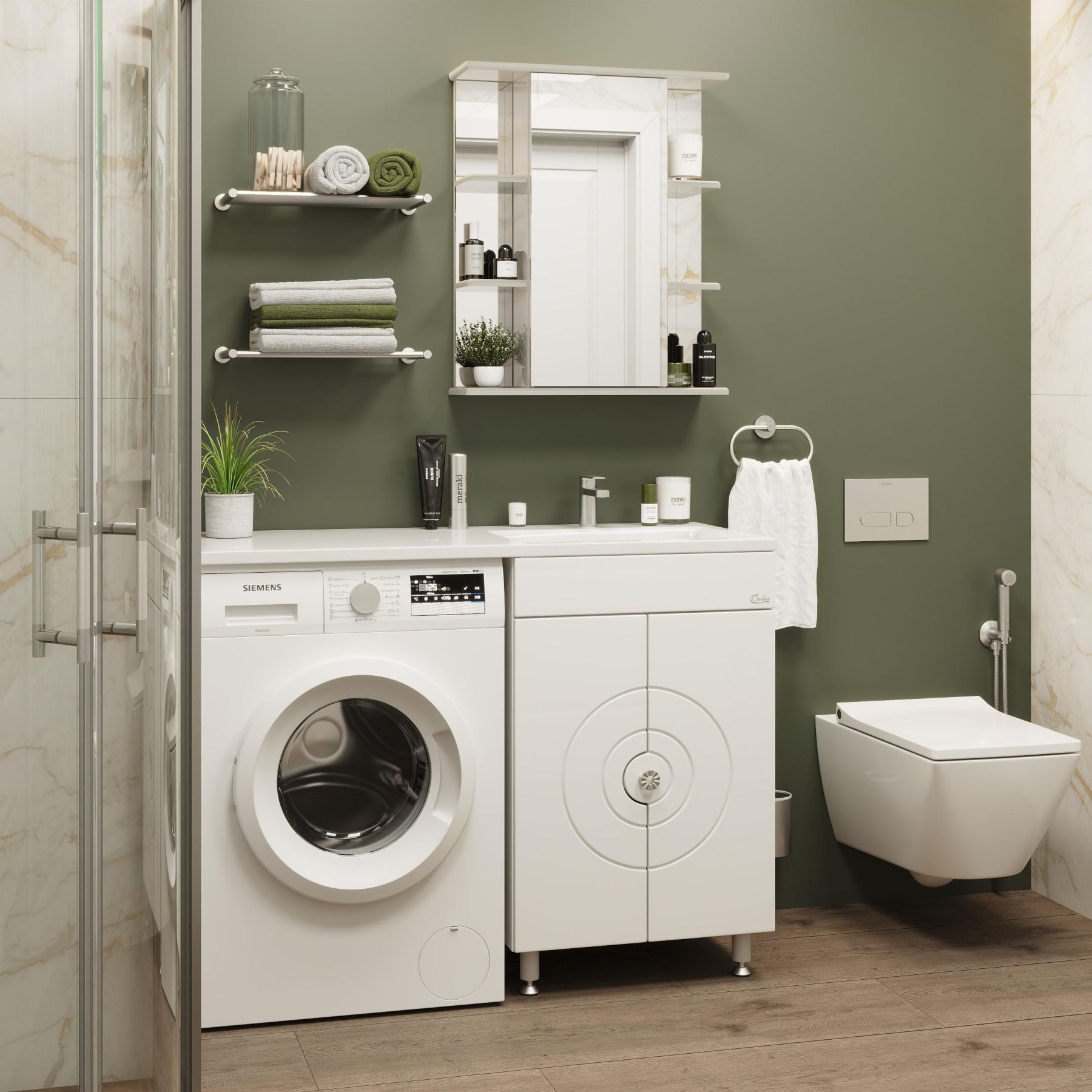Фасад украшают 2 распашных фигурных двери, украшенные изящной фрезеровкой и снабженные системой плавного закрывания, за ними - большое пространство для хранения банных принадлежностей или бытовой химии, разделенное горизонтальной полочкой.
