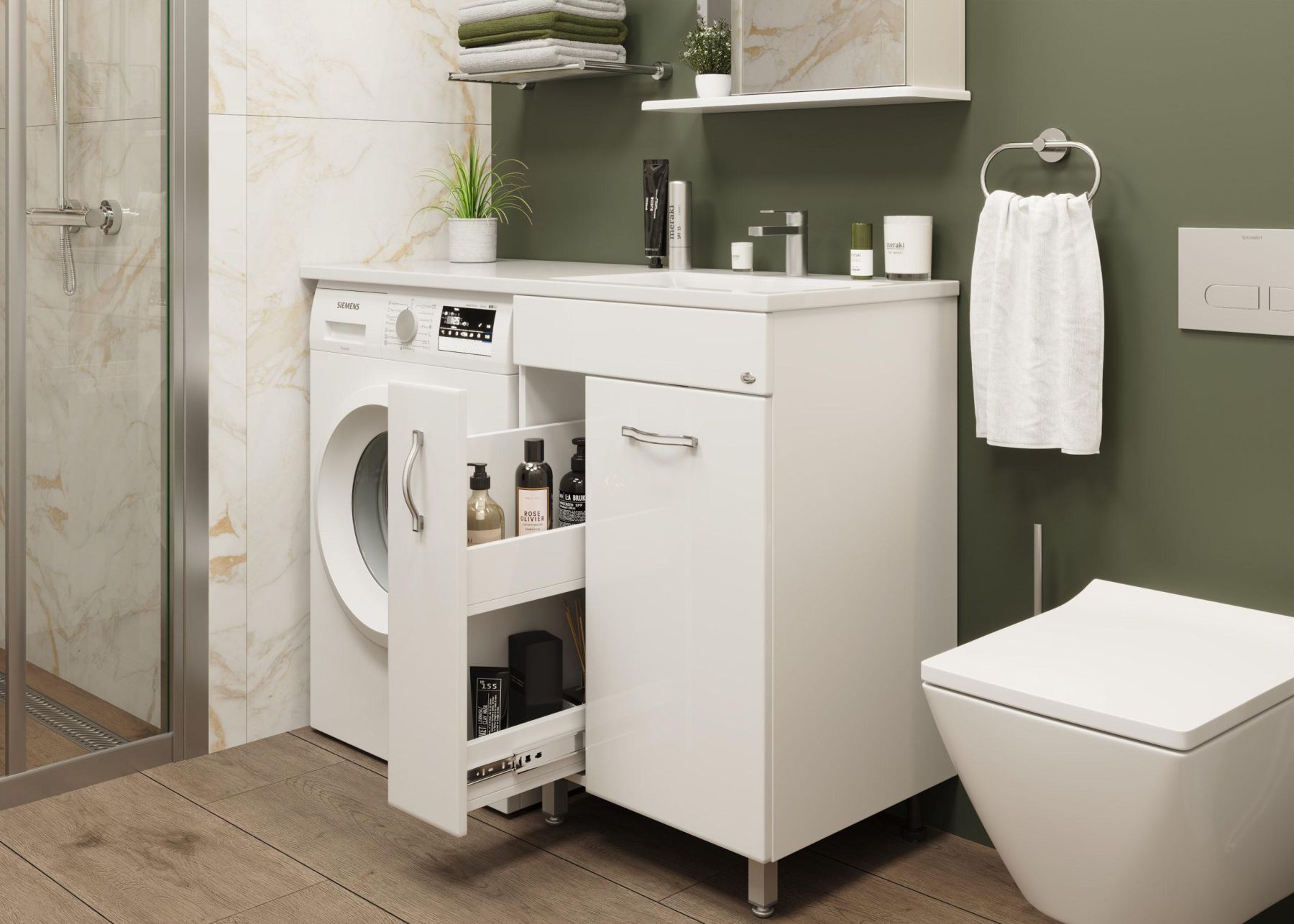 Пространство внутри тумбы очень функционально: слева высокий выдвижной ящик с двумя узкими отделениями для размещения бутылок бытовой химии, а справа - классическая распашная дверь скрывает нишу, разделенную горизонтальной полочкой, в которой будет удобно хранить банные принадлежности.