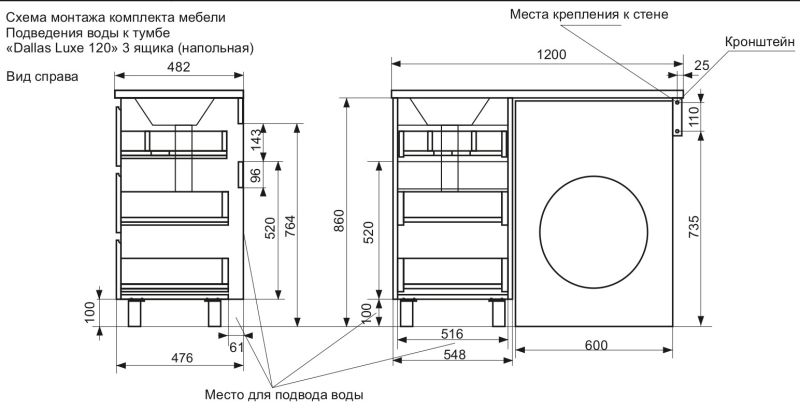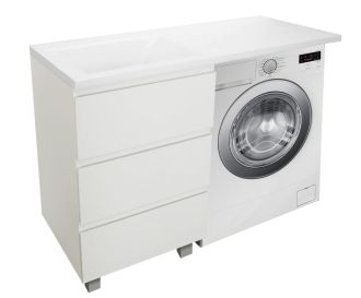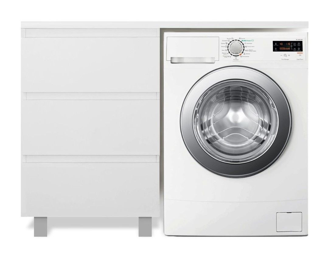 Приоритетом в выборе тумбы с раковиной является площадь ванной комнаты. Функциональная тумба с тремя ящиками решит вопрос для большинства покупателей. Тумба укомплектована раковиной из литьевого мрамора с удобной чашей, стиральная машина устанавливается под столешницей. Три ящика позволят распределить как крупные, так и мелкие вещи.