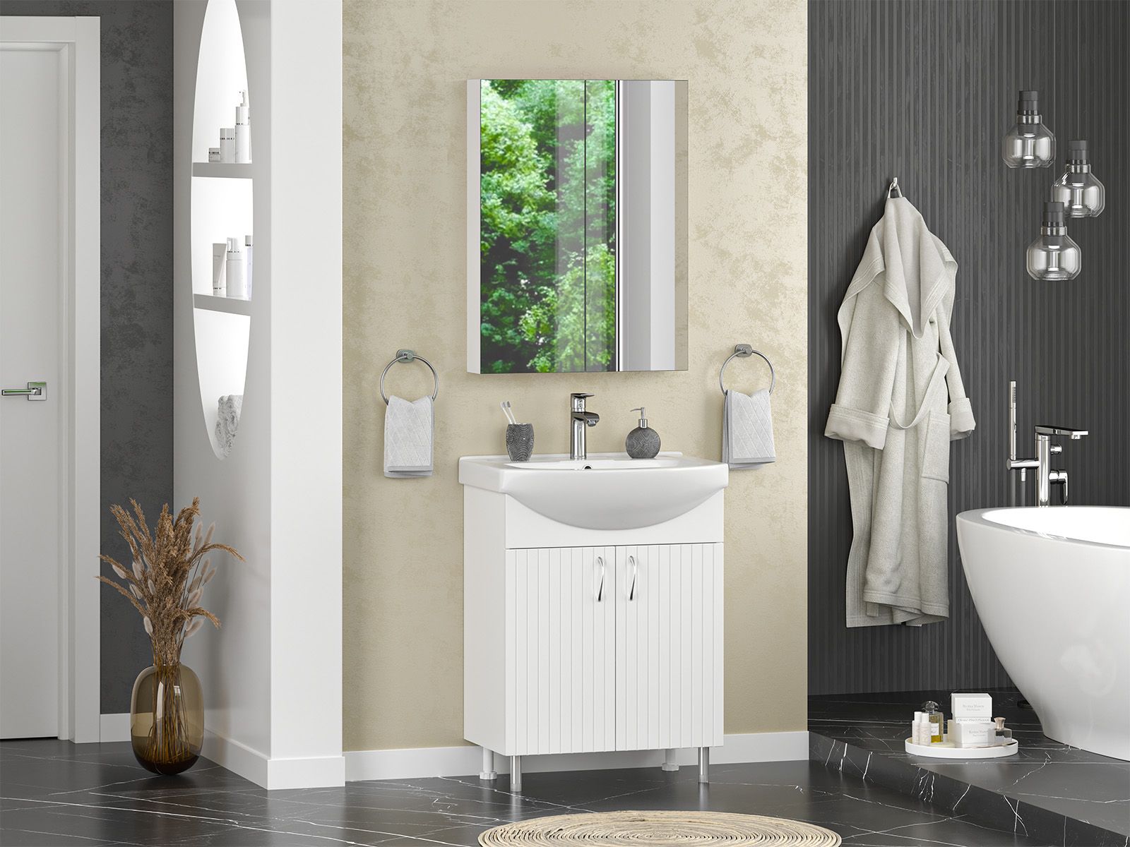 Напольная тумба под раковину – это не просто элемент мебели, но настоящее произведение искусства, которое сочетает в себе функциональность и изысканный дизайн. Изготовленная из высококачественных материалов, она гарантирует долговечность и устойчивость к воздействию влаги.Удобная система хранения позволяет размещать все необходимое для гигиенических процедур, а её продуманные размеры отлично вписываются даже в небольшие помещения. Стильные ручки и элегантные фасады придают тумбе особый шарм, а разнообразие цветовых решений позволит выбрать модель, соответствующую любому интерьеру – от классического до модерн.Мягкие линии и непринужденные формы делают тумбу неотъемлемой частью ванной, превращая её в любимое место для отдыха. Совершенное сочетание эстетики и практичности позволяет создать гармоничный и стильный интерьер, что делает напольную тумбу для ванной комнаты идеальным аксессуаром для любого дома.