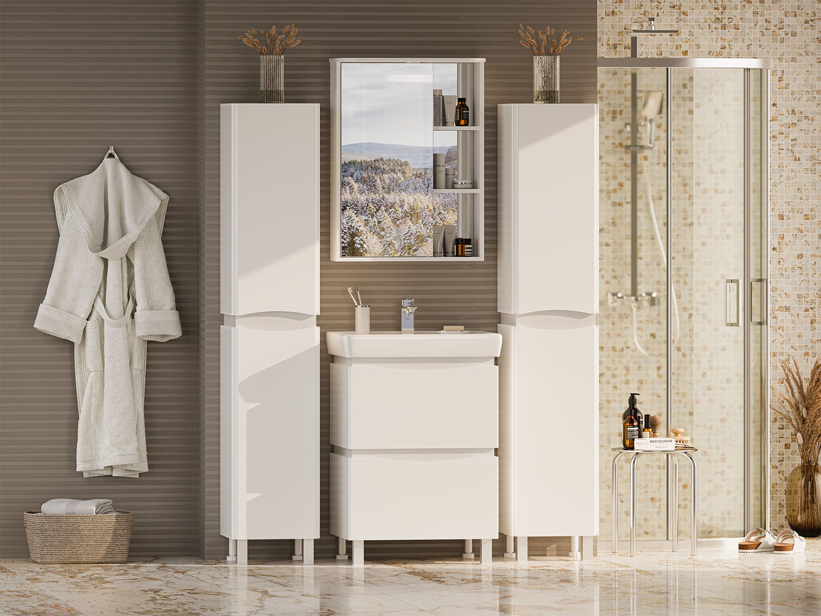 Напольная тумба под раковину – это не просто элемент мебели, но настоящее произведение искусства, которое сочетает в себе функциональность и изысканный дизайн. Изготовленная из высококачественных материалов, она гарантирует долговечность и устойчивость к воздействию влаги.Удобная система хранения позволяет размещать все необходимое для гигиенических процедур, а её продуманные размеры отлично вписываются даже в небольшие помещения. Стильные ручки и элегантные фасады придают тумбе особый шарм, а разнообразие цветовых решений позволит выбрать модель, соответствующую любому интерьеру – от классического до модерн.Мягкие линии и непринужденные формы делают тумбу неотъемлемой частью ванной, превращая её в любимое место для отдыха. Совершенное сочетание эстетики и практичности позволяет создать гармоничный и стильный интерьер, что делает напольную тумбу для ванной комнаты идеальным аксессуаром для любого дома.