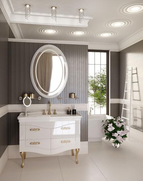 Необычная форма безупречно-белого глянцевого фасада удивительным образом гармонирует с яркой фурнитурой цвета состаренного золота визуально расширяет пространство и наполняет его светом.