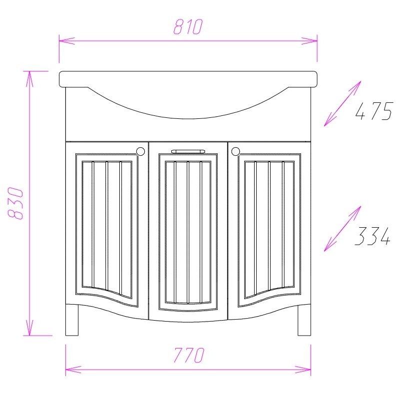Размеры тумбы без учета раковины и ножек: 77x33x68 см.