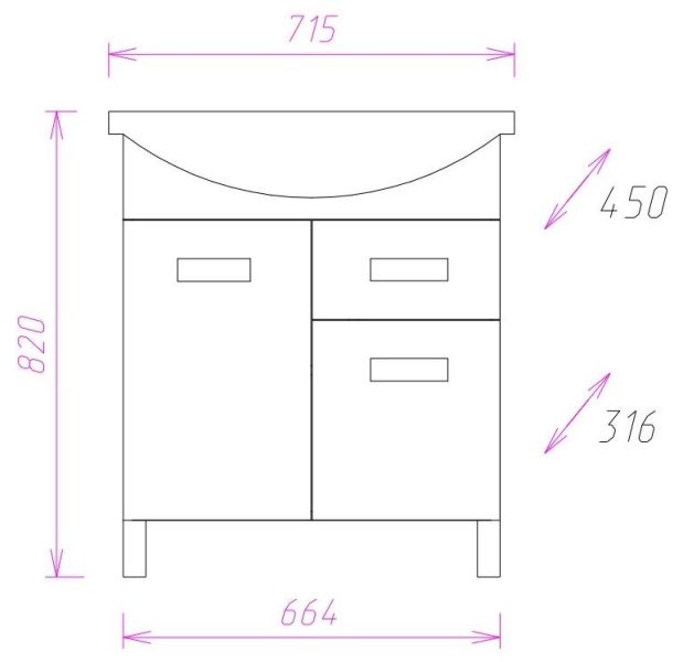Размеры тумбы без учета раковины и ножек: 66x31x68 см.