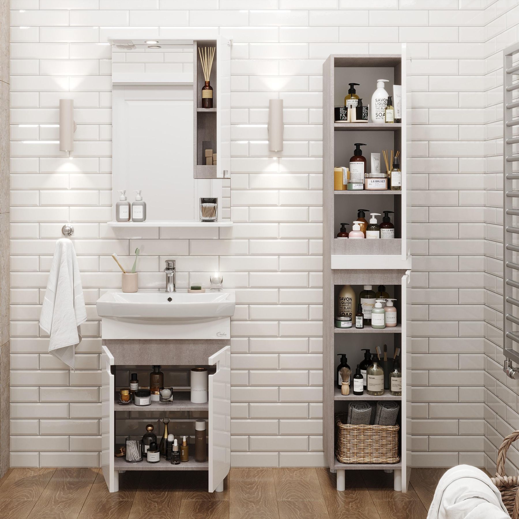 Одно большое отделение с полкой за двумя распашными дверцами, оснащенными системой плавного закрывания, позволит вместить все необходимые в ванной мелочи.