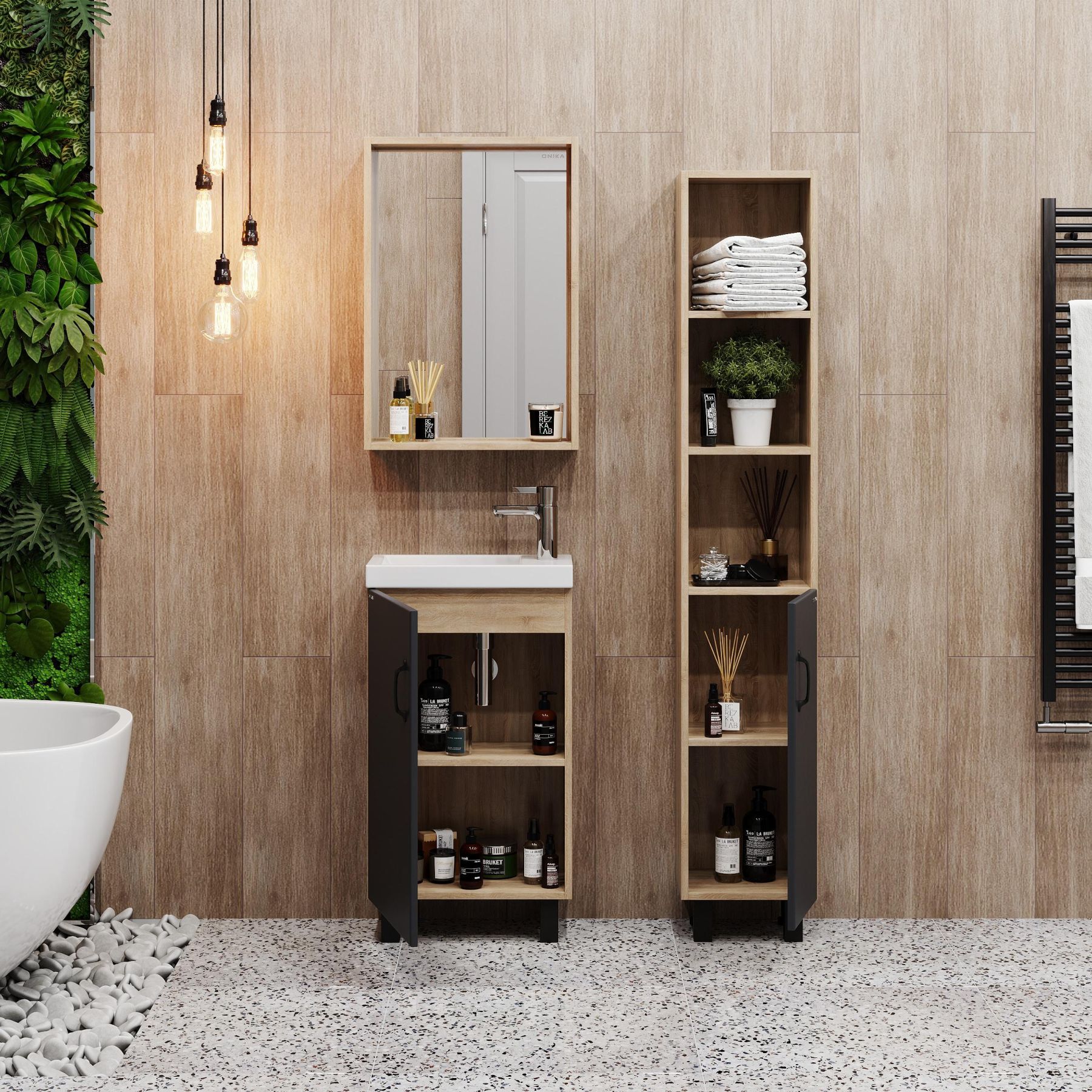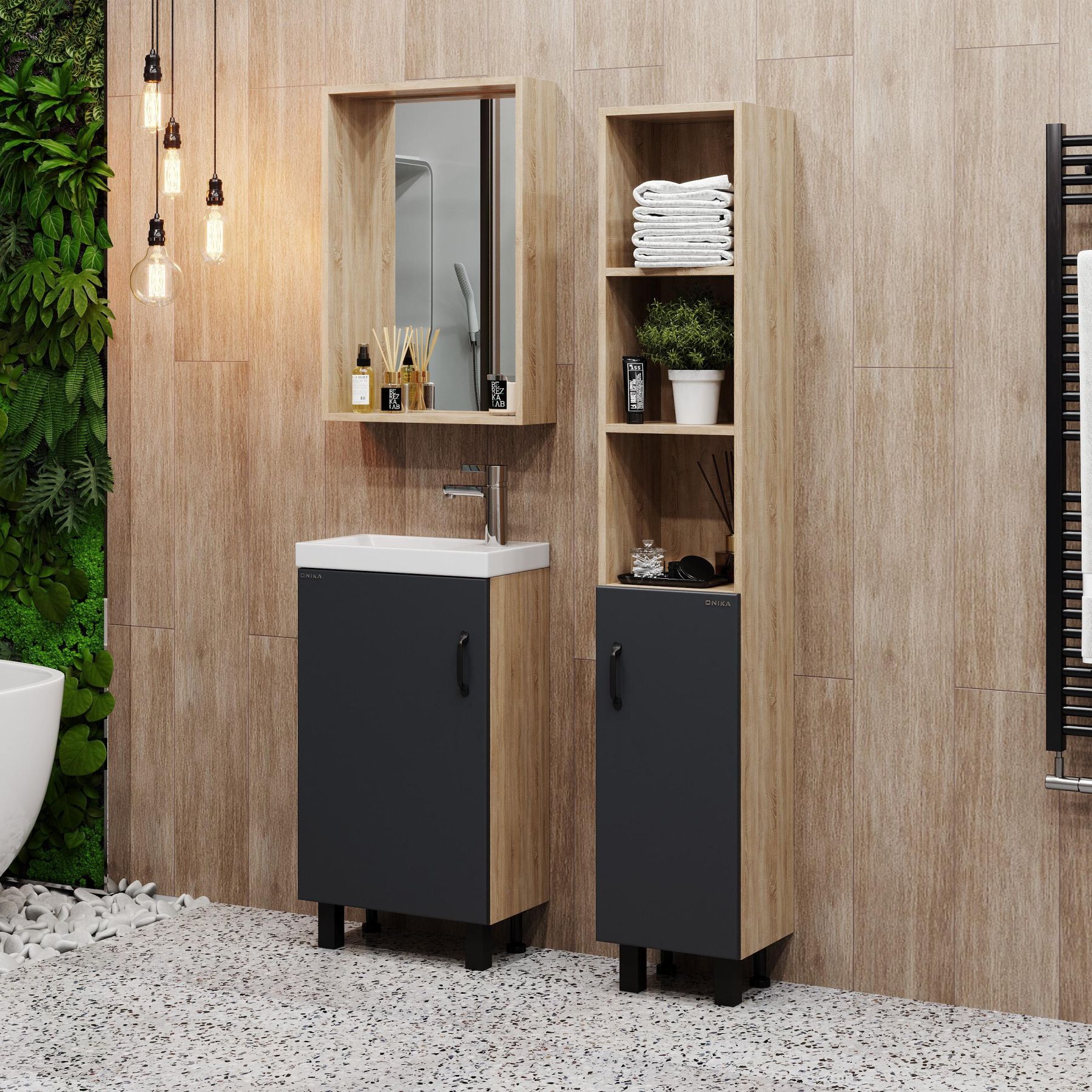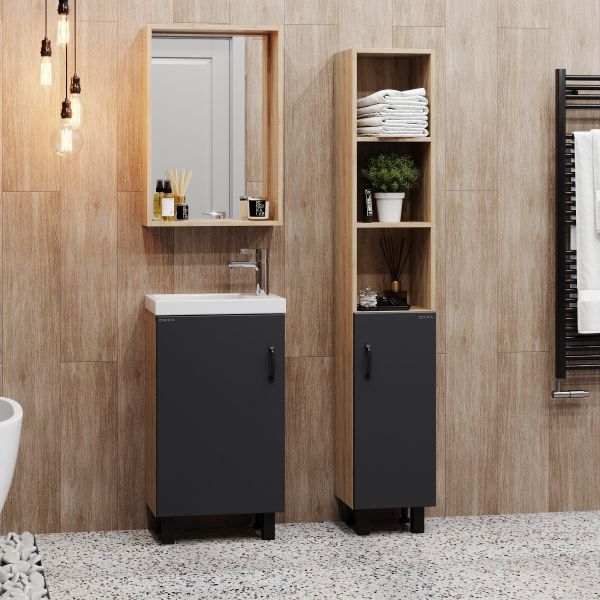 В тумбе Onika Тимбер 45 удачно сочетаются контрастные цвета и фактуры: серый матовый фасад с покрытием SoftTouch, корпус цвета дуба с роскошной текстурой, черная матовая металлическая фурнитура.